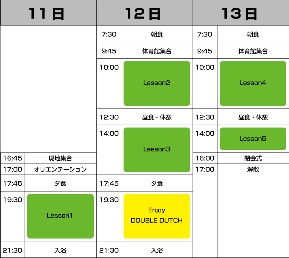 2020年も「DOUBLE DUTCH CONTEST JAPAN FINAL 2020」後に、開催されますダブルダッチスプリングキャンプ! 今年は50名限定で、内容の濃いキャンプとなります。 国内を代表するプロプレイヤーのレッスンはもちろんのこと、様々な交流企画も予定しております。 交流・技術アップなど目的が様々でも全く問題ございません!! ※対象は中学生以上となっております。たくさんの方のお申し込みをお待ちしております! |
